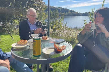 Jag ringde Björn, och självklart ville de att vi skulle komma. När vi rullade in hade de precis kommit hem efter egna äventyr på Basteviksholmarna. Marie skickade iväg Björn för att köpa bullar eftersom de inte hade något hemma, men det hade hon inte behövt – även om bullarna var riktigt goda, så vi klagade ju inte. Vi satt en bra stund i deras kök, fikade och tjötade. Skrattade, pratade resor och planer. De funderar på att dra söderut efter jul, precis som förra gången. Och det lutar åt att vi gör samma.
