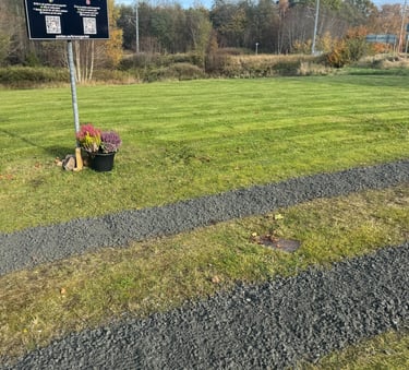 Men mitt i allt fixande dök en liten detalj upp. Den där backen ner till ställplatsen. Den såg oskyldig ut, men så fort det blev lite dagg eller regn så var den hal som en skridskobana. Jag kände direkt – det här måste fixas! Men tiden sprang iväg, som den alltid gör när man har hundra bollar i luften, och vi hann inte innan helgen.