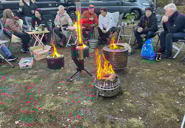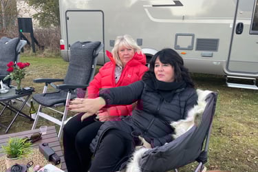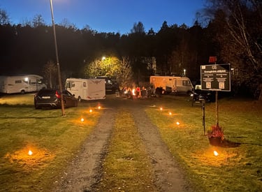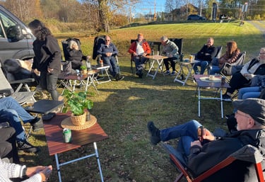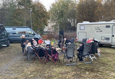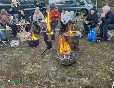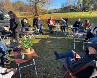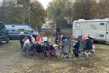 Vi var sju husbilar totalt, och vilket gäng det blev! Björn och Marie kom, trots att de lämnat in sin husbil till försäljning. De tog med sig sina stolar ändå, såklart, redo för eld och tjöt som vanligt.