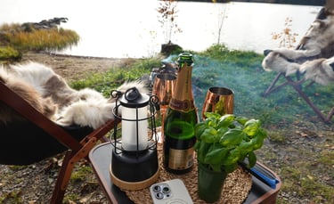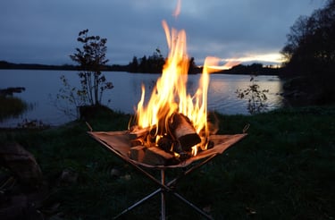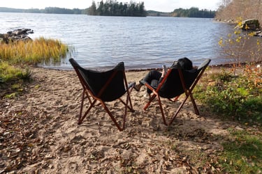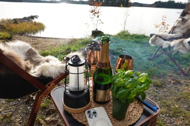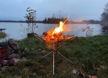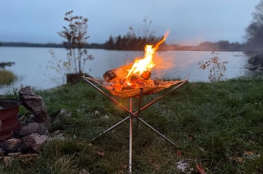Men nu har vi sett det uppe – och det blir kanon. Det väger bara 14 kilo, vilket är helt okej. Vi köpte det på Campingvaruhuset, och det känns verkligen som en perfekt lösning för plåtisar som vill ha lite extra utrymme. När tältet var testat var det dags att fokusera på det viktigaste: maten. Vi tände elden, kröp ner i våra butterflystolar, och njöt av värmen.