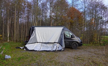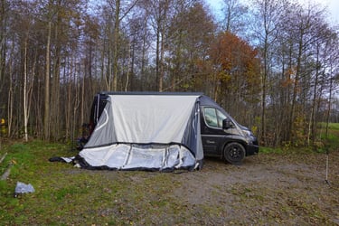 När han åkt tände jag en liten brasa – det var kyligt i luften. Sen var det dags för premiär av vårt nya tält! Och ja, du vet hur det är när man ska göra något för första gången. Det tar alltid lite längre tid än man tänkt. Men vi har ju rutin – minns du vårt gamla Kampa Air-tält till husbilen? Så vi satte igång med gott mod. Och vet du vad – det gick faktiskt ganska bra! Vi blåste upp det som skulle blåsas upp, bara en kanal, och fick se hur det såg ut i all sin glans. Men vi valde ändå att inte spänna upp det helt. Marken var grusig, regnet var på väg, och vi tänkte att det här får vänta tills vi står stilla längre fram, söderut.