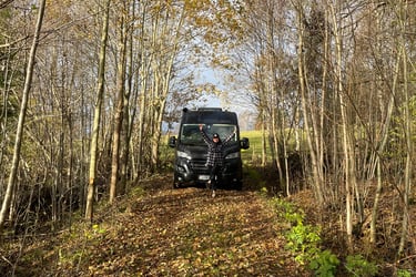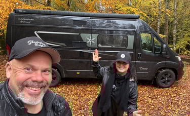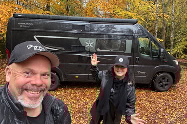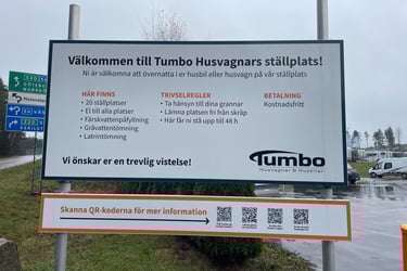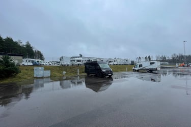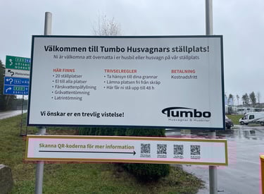 Efter mötet rullade vi vidare uppåt i landet, mot Tumbo Husbilar. Vi har sett många vänner stå där, så nyfikenheten var stor. Vi hann precis in innan stängning, och wow – så många olika märken! Men vet du vad som slog oss? Tre säljare stod i en klunga. Ingen sa hej. Ingen tittade ens upp. Alltså, jag förstår om man har mycket att göra, men ett hej kostar ju inget. Vi gick runt länge, kikade i både husbilar och plåtisar – men känslan blev sådär. Så vi sa till varandra: de måste sälja ändå – utan att säga hej. Vi skrattade åt det hela, gick ut, och satte dit ett GlampingExplorer-klistermärke som traditionen bjuder. Jag tänkte först sätta det över ME Campings märke – men jag sansade mig. Hahaha ..... Ställplatsen där var annars enkel: asfaltsyta med gratis el och tömning. Inte charmigt, men väldigt praktiskt – och sånt uppskattas.
