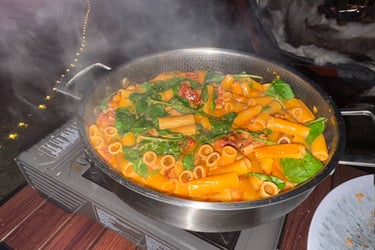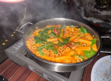På menyn? En One Pot Pasta – vår favorit. Vi använder vår traktörpanna från Portugal ofta som ni vet, den har hängt med i flera år, på vår gasolplatta och den levererar varje gång. Den här gången blev det pasta med pancetta, buljong, lök, vitlök, grädde och lite annat smått och gott. När allt kokat ihop toppade vi med riven ost, slog upp ett glas rött och bara… njöt. Vi åt där vid elden, med månen som sällskap och sjön bara några meter bort. Det var en sån där kväll man aldrig vill ska ta slut.