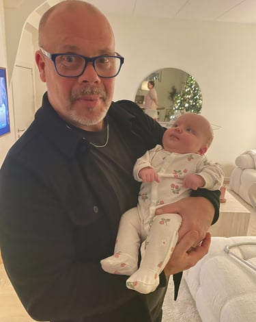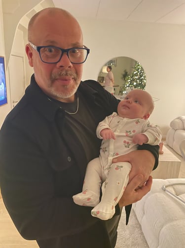Jag har ju blivit farfar. Bara det är en mening som fortfarande känns lite märklig att skriva – men på ett väldigt fint sätt. Lilla Alba. Vi var hemma hos dem innan vi åkte och gav henne julklappar i förskott. Klänningar, lite gulliga små saker… sånt där som man absolut inte kan låta bli att köpa. Och vet du vad? Alba brydde sig exakt noll. 😂