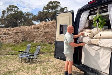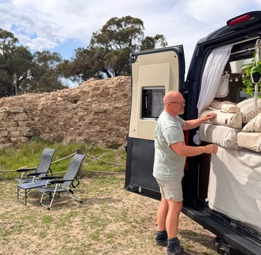 Till slut hittade vi deras plats. Där stod Björn och tvättade av sin Knaus, för det hade kommit lite Calima under natten.