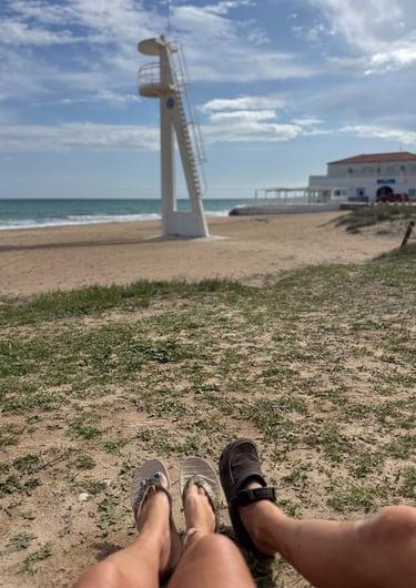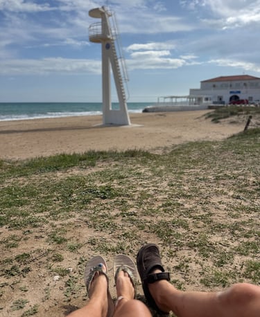 Vi satt på strandpromenaden i några sköna stolar längst fram mot havet. Drack varsin sangria och njöt av solen.