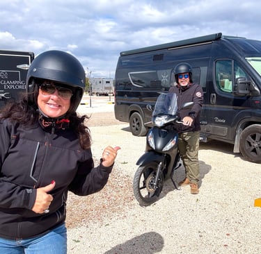 Vi parkerade scootern bland stora motorcyklar som såg ut som riktiga monster. Men vår lilla maskin fick också plats där. Den stod tryggt medan vi gick runt i stan.